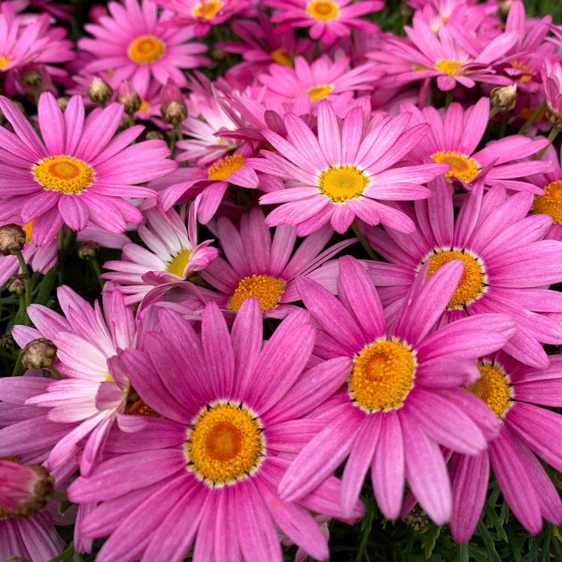 Short-lived perennial shrub with pink daisy-like, orange centred flowers and dark green foliage.