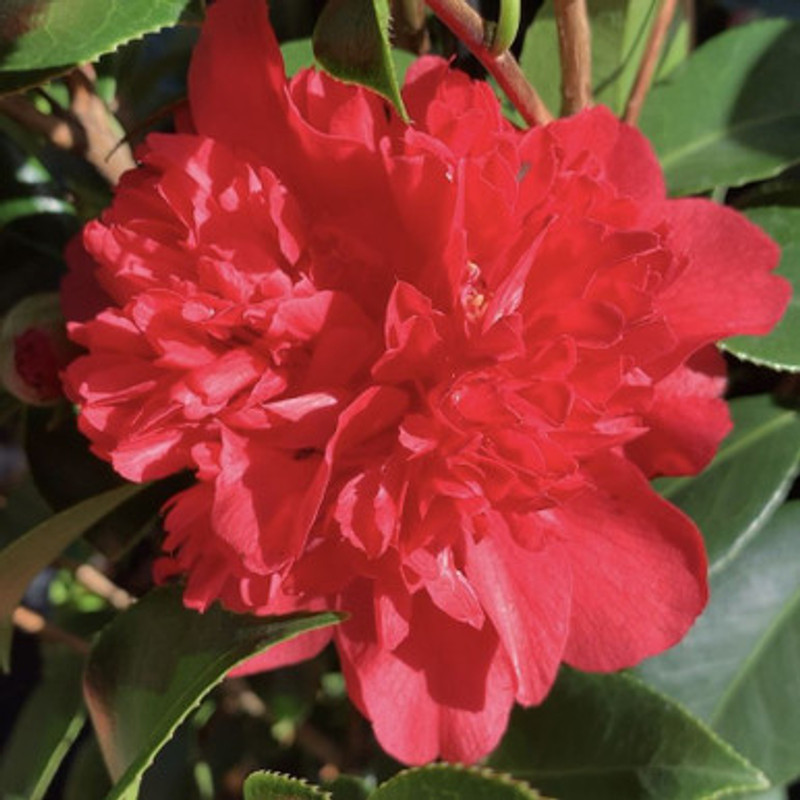 Large, bright red, formal double blooms are borne early to mid-season on a vigorous shrub with bushy growth.