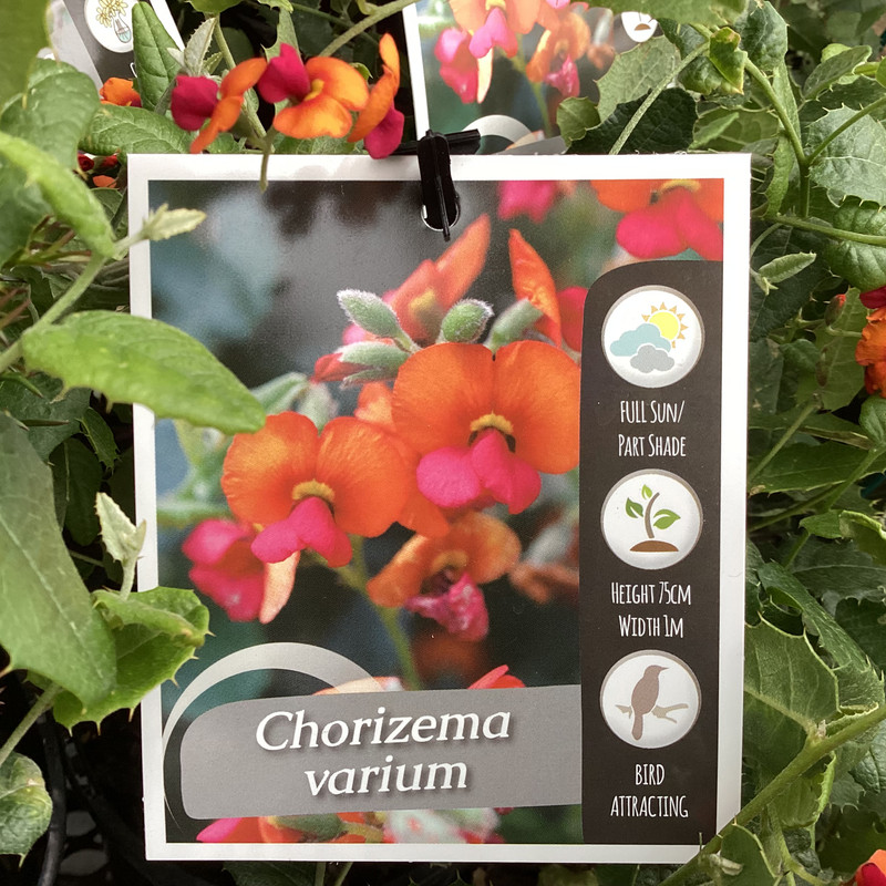 Chorizema varium or Flame Pea is a compact growing small shrub which bares masses of flame orange and pink pea like flowers above holly like foliage. Attracting colourful seed and nectar-loving birds, various insects, it is a welcome addition to the garden. Flowering occurs sporadically throughout the year with main flowering in Spring. Tolerant of alkaline soils. Tip prune young plants after flowering to maintain a dense habit. Mulch around the base of the plant to preserve moisture over the drier months of the year.