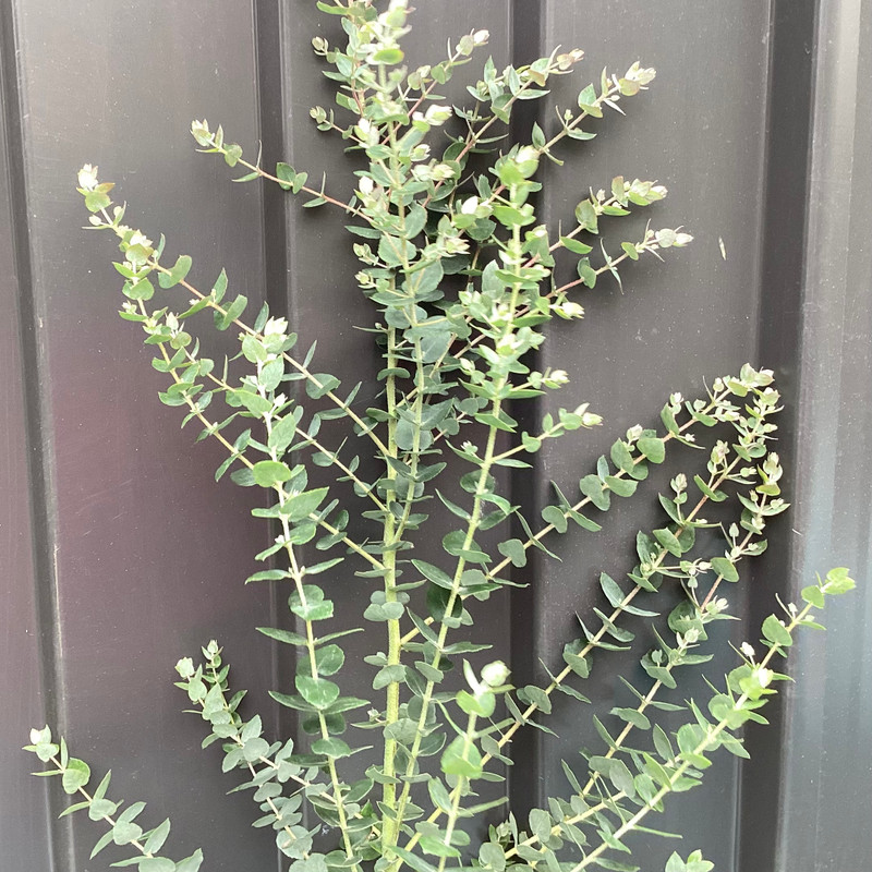 It is super tough because it has a lignotuber. Once established it is resilient to fire and even snow. As a result it can be coppiced and will reshoot from the lignotuber at the base of its trunk. It can be kept as a bushy shrub with juvenile foliage by cutting periodically to 20-30cm from the base or a useful small/medium tree or screen. It will brighten dark corners as it has bushy aromatic silvery blue green foliage. It responds well to coppicing and pollarding and can grow 1-1.5 m per year when well watered. Not many eucalyptus are happy in part sun, but this one is. Young shoots are often a silvery rose colour with a white blooms, glaucous buds, twigs and underside of the leaves give the whole plant a silvery appearance.