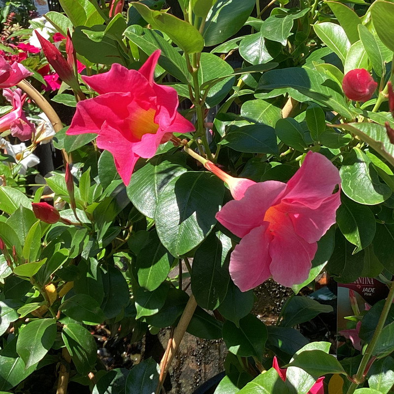 Jade Pink is a compact Dipladenia ideal for flower beds, patio pots and looks great planted in groups for a mass flowering display. Pink coloured flowers are on show throughout the warmer months over shiny evergreen foliage.