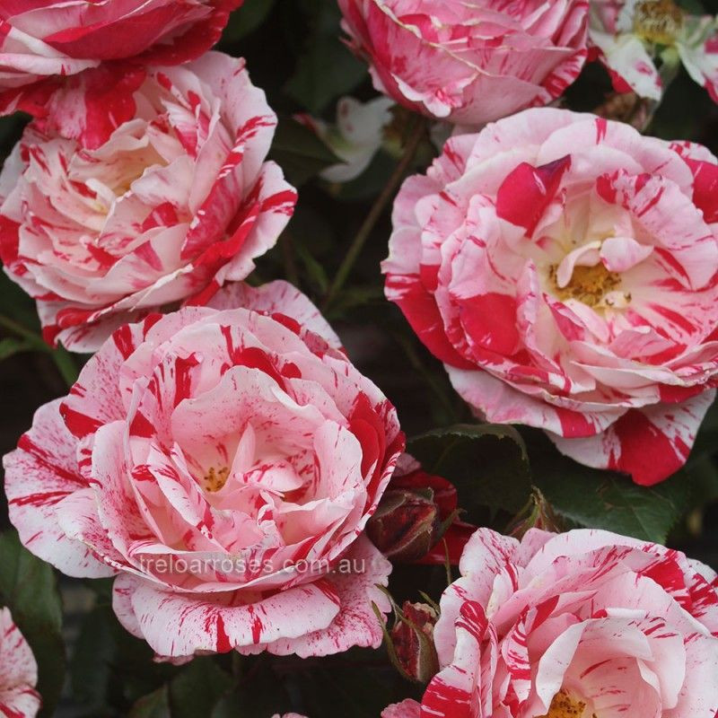 The overall appearance of stripes in a combination of burgundy-red and creamy white swirls. These unusual blooms are produced freely and carry a spicy fragrance. Deep green foliage. Vigorous growth. Height to 1.2m.